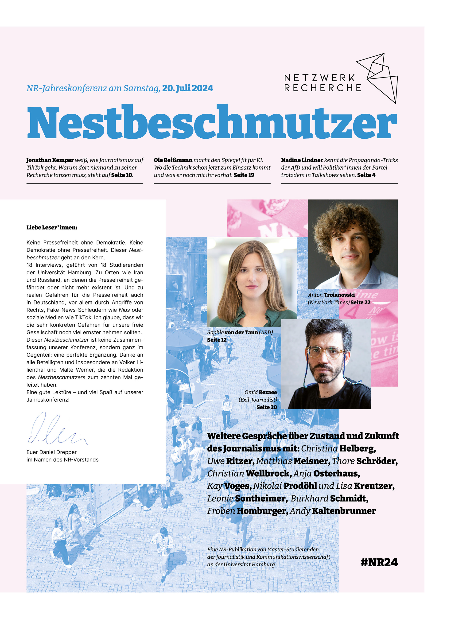 Bis 2024 entstand in Kooperation mit Journalistik-Studierenden der Universität Hamburg eine Tagungszeitung als klassisches Printprodukt, die zuletzt im Interviewformat die Themen der Konferenz flankierte.