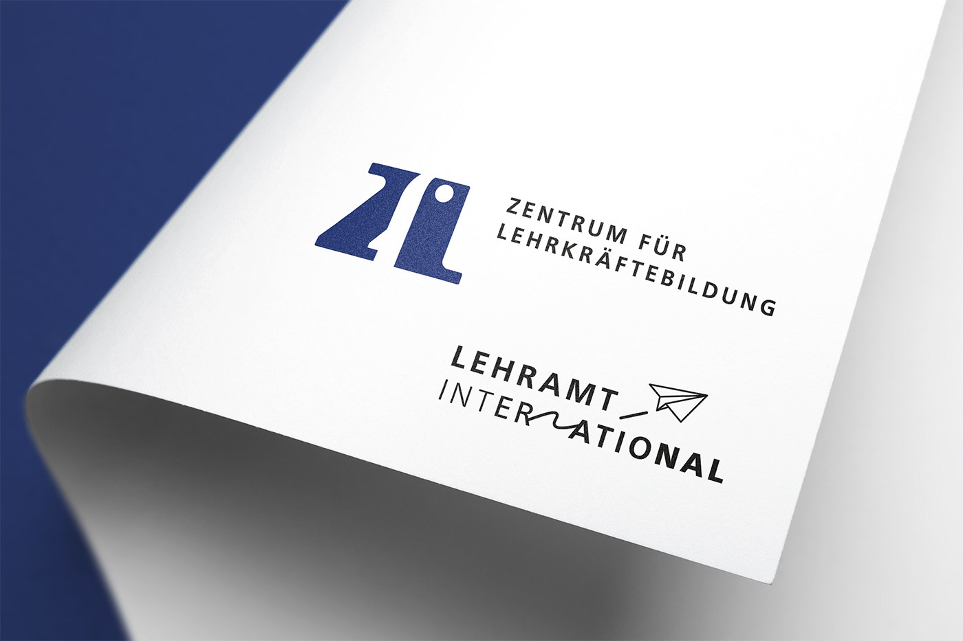 Die Wortmarke „Lehramt International“, ergänzt durch ein schlichtes, symbolisches Bildelement, das die globale Perspektive aufgreift. Dabei wurde sorgfältig auf eine visuelle Hierarchie geachtet, die die übergeordnete Rolle des Zentrums für Lehrkräftebildung als tragende Institution deutlich macht.